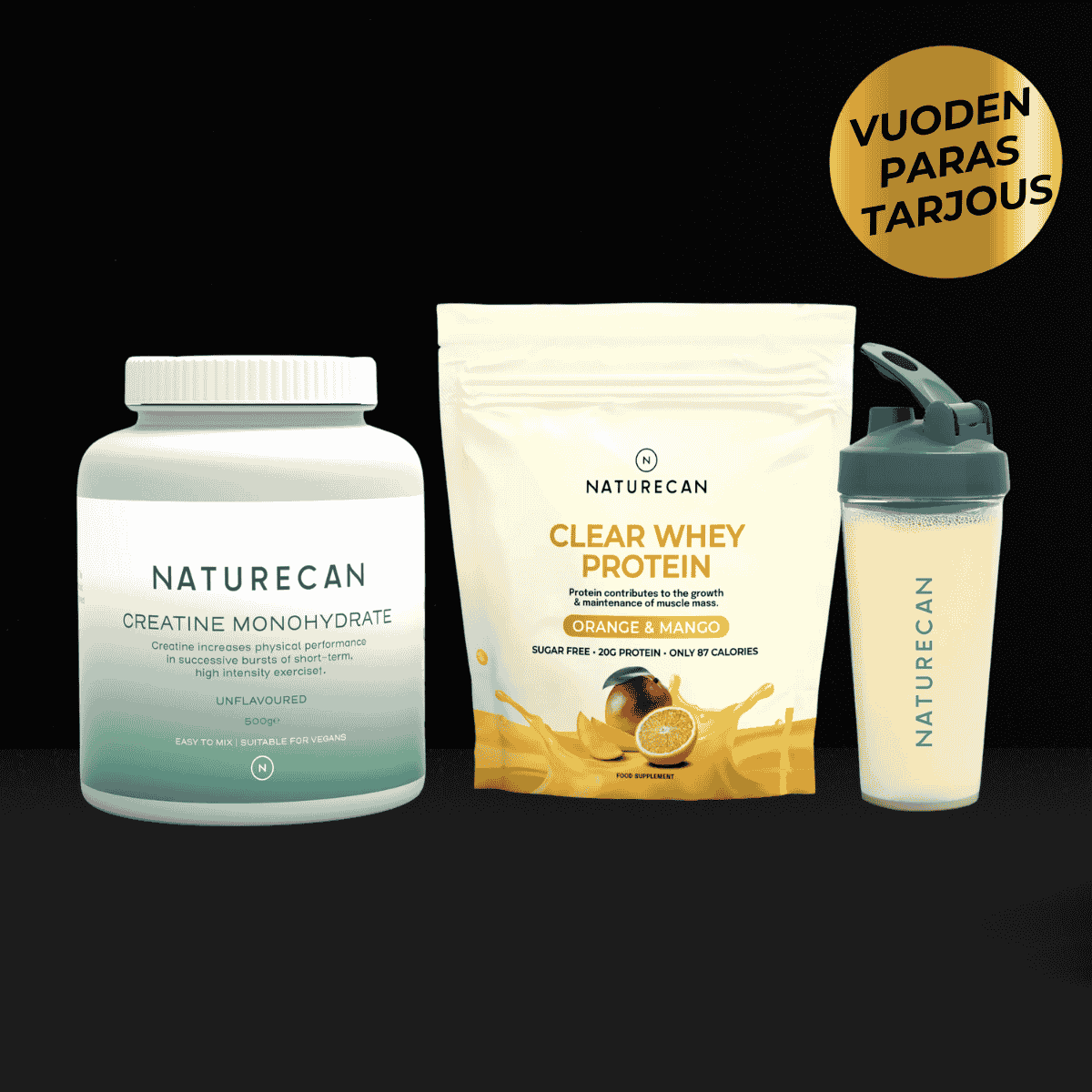 Fitnesspaketti on suunniteltu tukemaan kuntomatkasi jokaista osaa. Se sisältää ensiluokkaista kirkasta heraproteiinia persikkaisen jääteen makuisena, tehokasta kreatiinimonohydraattia ja kätevän shaker-pullon, ja se tarjoaa kaikki ravintoaineet, joita kehosi tarvitsee palautuakseen ja suoriutuakseen päivästä toiseen.